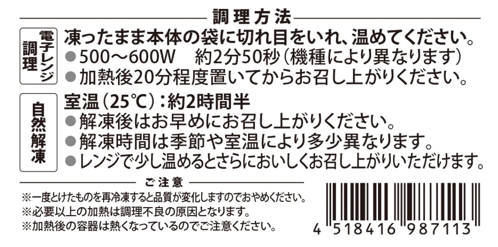 (2) 加熱後、電子レンジから取り出しそのまま20分ほど置いてからお召しあがりください。