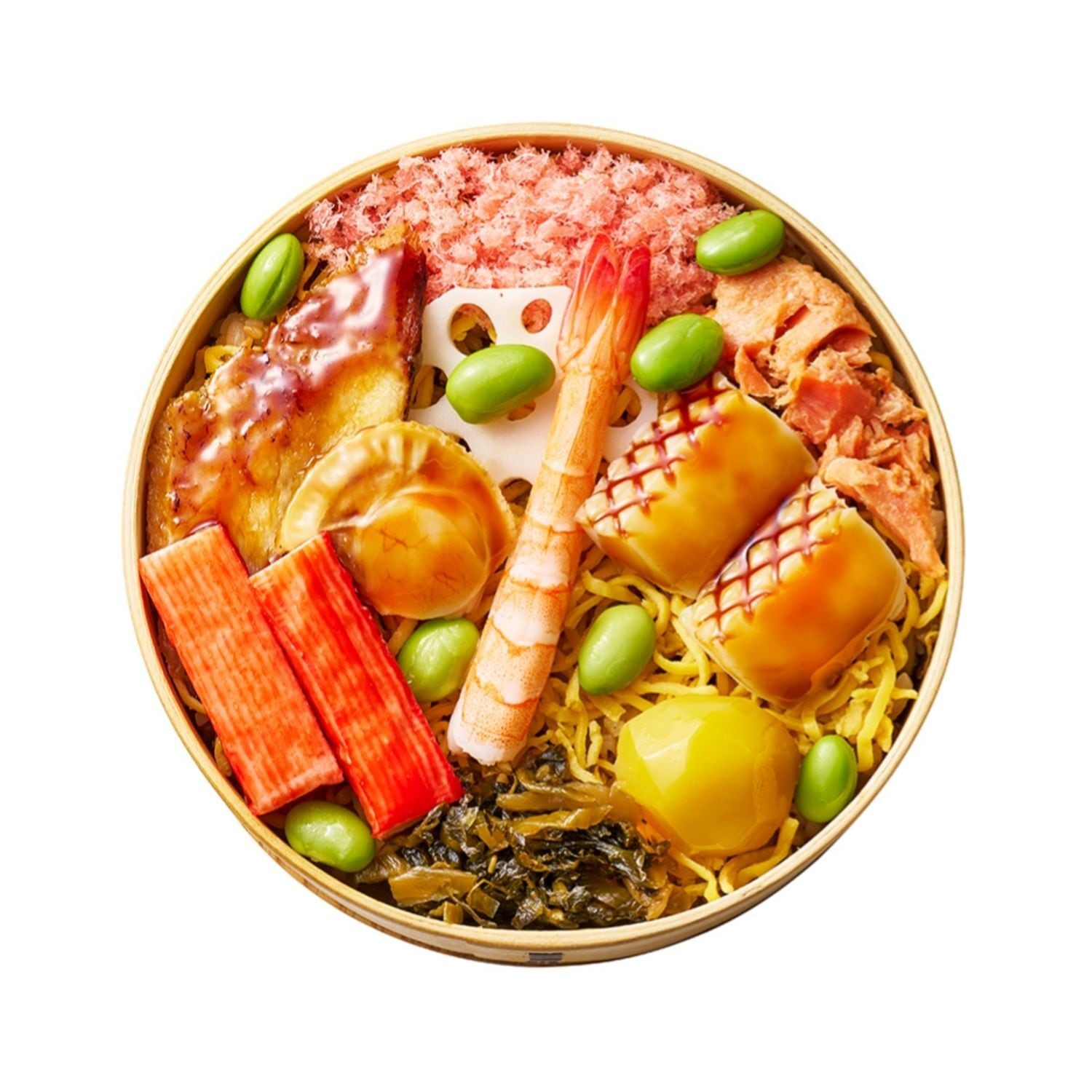 上方鮨の箱鮨を連想させる色鮮やかな冷凍のモザイク鮨。それぞれの具材に合わせた2種類の混ぜシャリを使い、かに・酢〆真鯛・ます・〆さば・穴子・漬け真いか・酢〆えび・厚焼き玉子・高菜・焼鯖 を押しました。